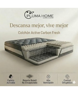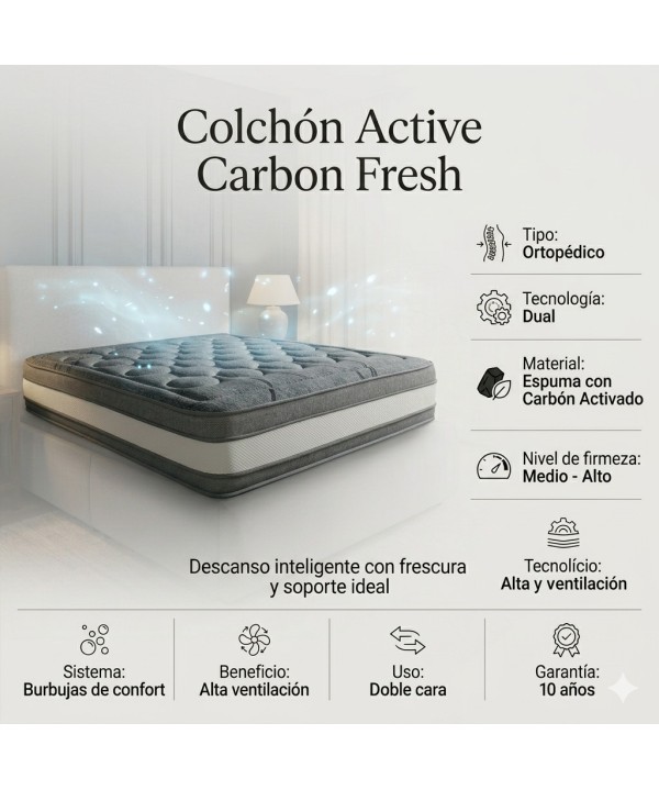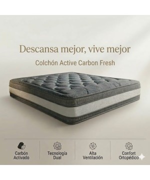 Descansa mejor cada noche con el Colchón Active Carbon Fresh: soporte ortopédico, frescura continua y confort ideal. Su espuma con carbón activado controla la humedad y los olores, mientras su ventilación mantiene una temperatura agradable. Diseño doble cara y firmeza medio-alta para mayor durabilidad y estabilidad. ¡El equilibrio perfecto entre descanso saludable y comodidad!